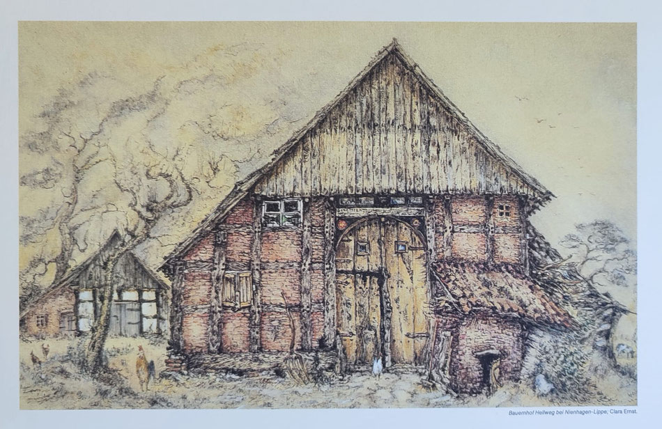 Leibzucht der Kötterstätte Hellweg in Pivitsheide VH, erbaut 1772. Zeichnung von Clara Ernst, um 1965 (Lippisches Landesmuseum Detmold)